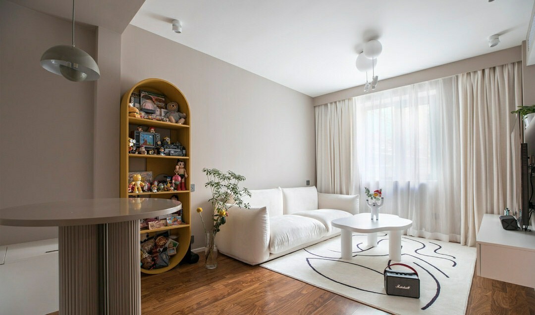 以半面隔墙作为电视背景墙,客厅与厨房相互连接又各自分开。筒灯+主灯,两个空间互相辅助光源