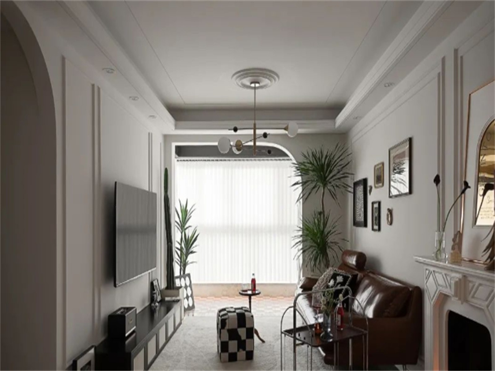 客厅,整张大地毯正好一改地面色彩,顶面设计简单中透出精致细节,与阳台之间一道弧线温柔过度