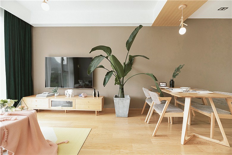 电视背景墙奶茶色,与绿植、原木家具、墨绿色窗帘形成色彩上的反差,也微妙的与地毯上的色块遥相呼应,加深色彩印象。