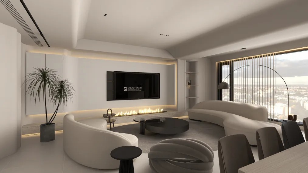 本案采用现代简约风格,利用简单线条的多元化打造空间,利用色彩的对比和整体相近色系来传达业主对生活品质的期许和追求。