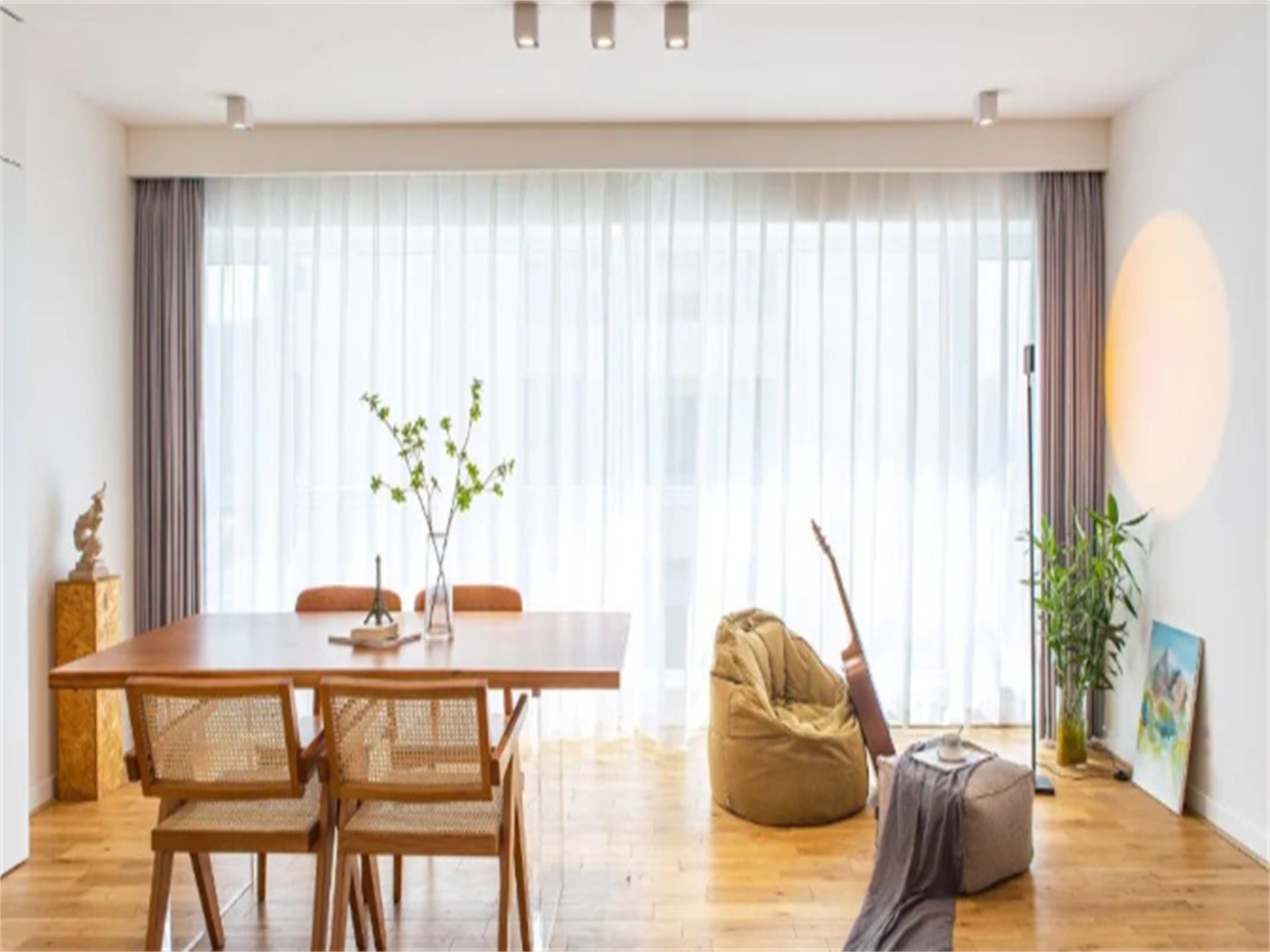 整个空间以白色与木色为主,通过简洁的硬装和温馨的木质家具,营造出舒适轻松的居家氛围
