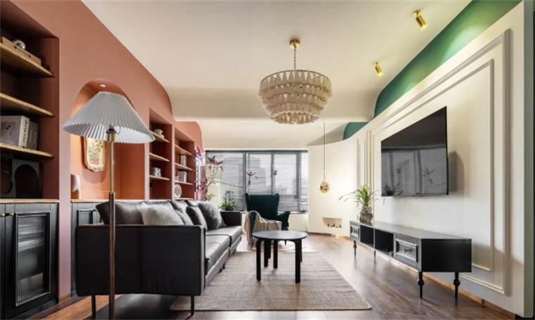 客厅,奶白、砖红、墨绿的组合勾勒出这个家的基调,原本突兀的横梁在融入弧形设计元素后,变成客厅中的一处亮点,在色彩的调和下,空间也更具层次感