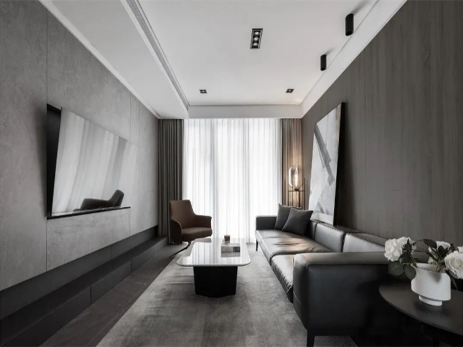 客厅选择业主偏爱的黑白灰为基调,极具个性的无主灯设计,简洁大气