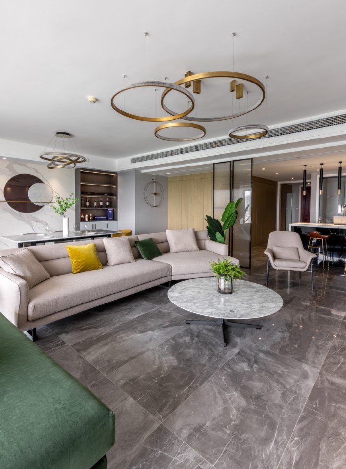 客餐厅和吧台西厨区之间做了磨砂玻璃的隔断,以增加通透感和美观度,即便是在吧台处,也丝毫不影响远眺湖景的角度。
