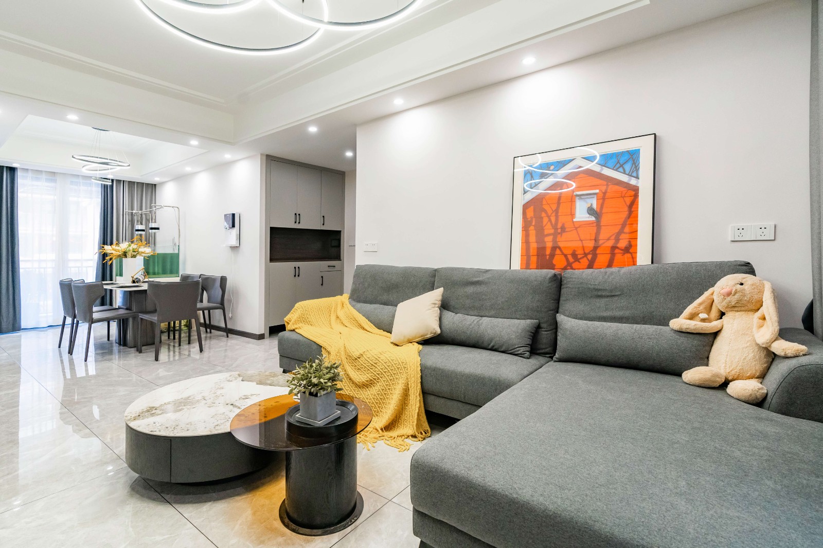 L型沙发,搭配高低圆形错位茶几,简洁时尚。