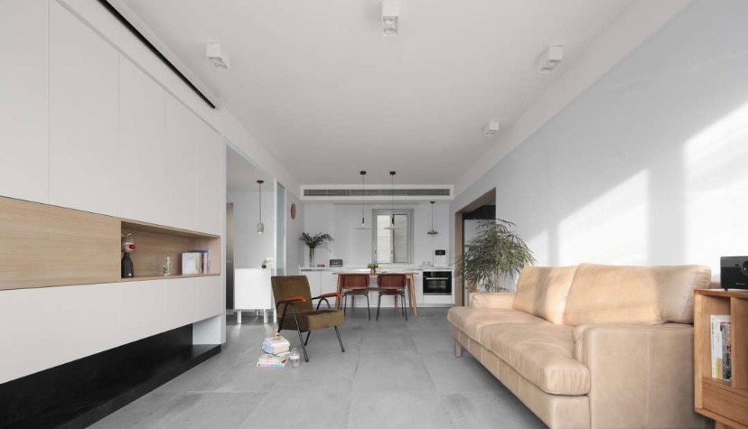 客厅摒弃传统的电视柜设计,以白系木质交错。带着质朴调性。