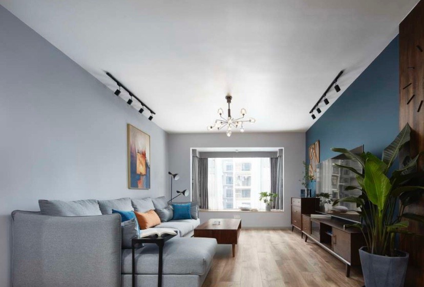 深蓝色的电视背景墙,搭配绿植,让空间更加自然舒适。