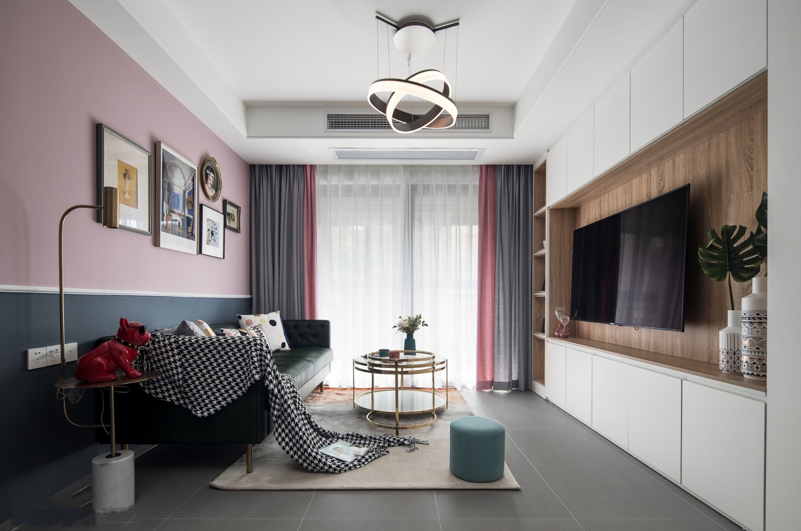 客厅的背景墙是空间设计的亮点,两个颜色的撞色设计,打造复古的基调。