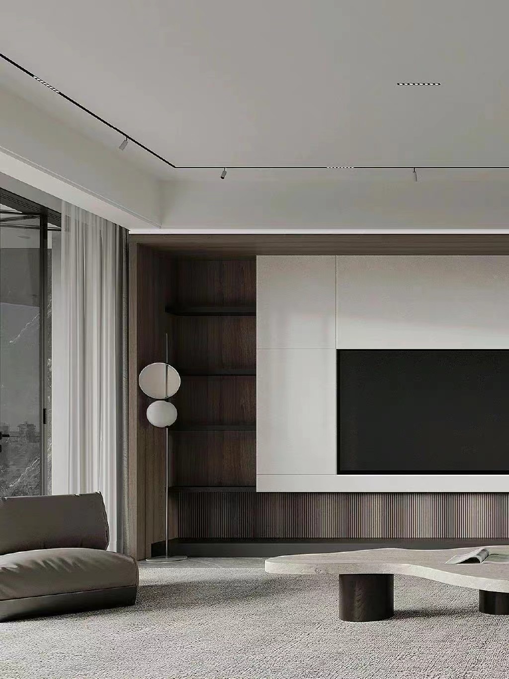 电视墙以咖色木杉格 白色岩板镶嵌壁挂电视体现