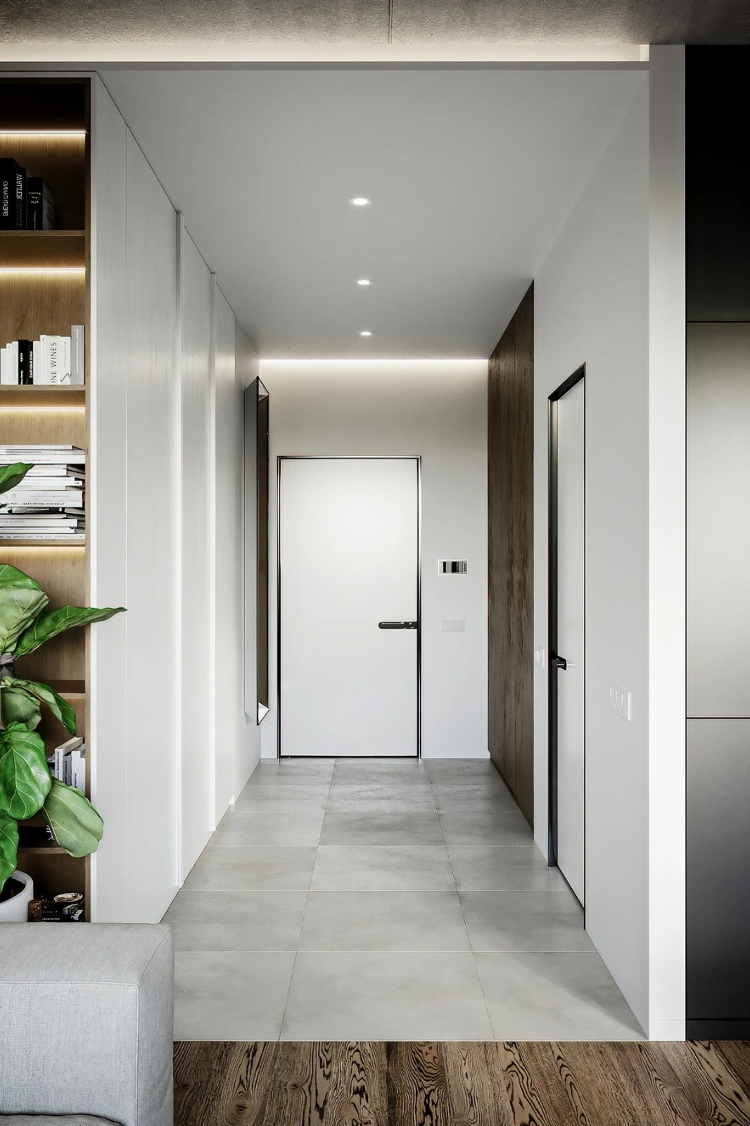 玄关区域明亮的白色,灰色的地砖搭配黑色的金属线条,现代感气息扑面而来。