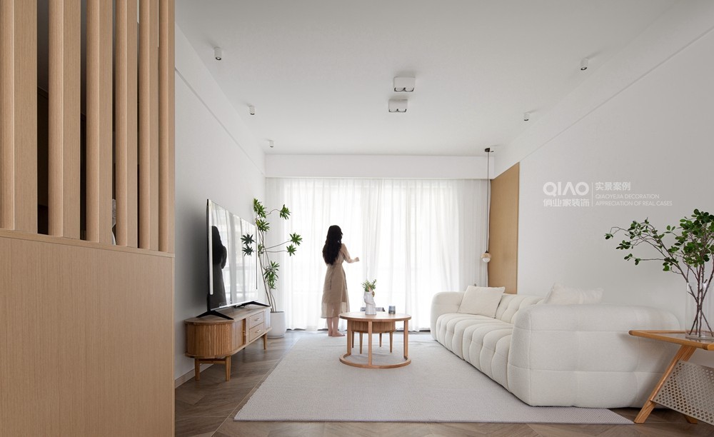 飘逸的面纱窗帘代替布艺窗帘,饱满丰盈的直排沙发,还有柔软的短绒地毯都是同一白色系,视觉上更加统一,同时给人一种柔软的包容感,可以将客厅的舒适感和氛围感***限度的呈现出来。