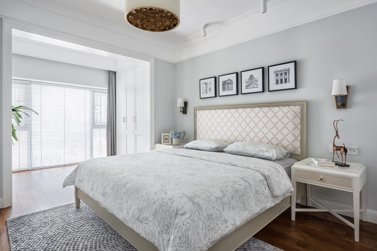 卧室明亮大气,整洁干净。卧室以白色系为主,打造出一种宽敞明亮的感觉。主灯造型独特,为卧室的点睛之处。床头柜简约高雅,搭配两处壁灯,很有氛围感。