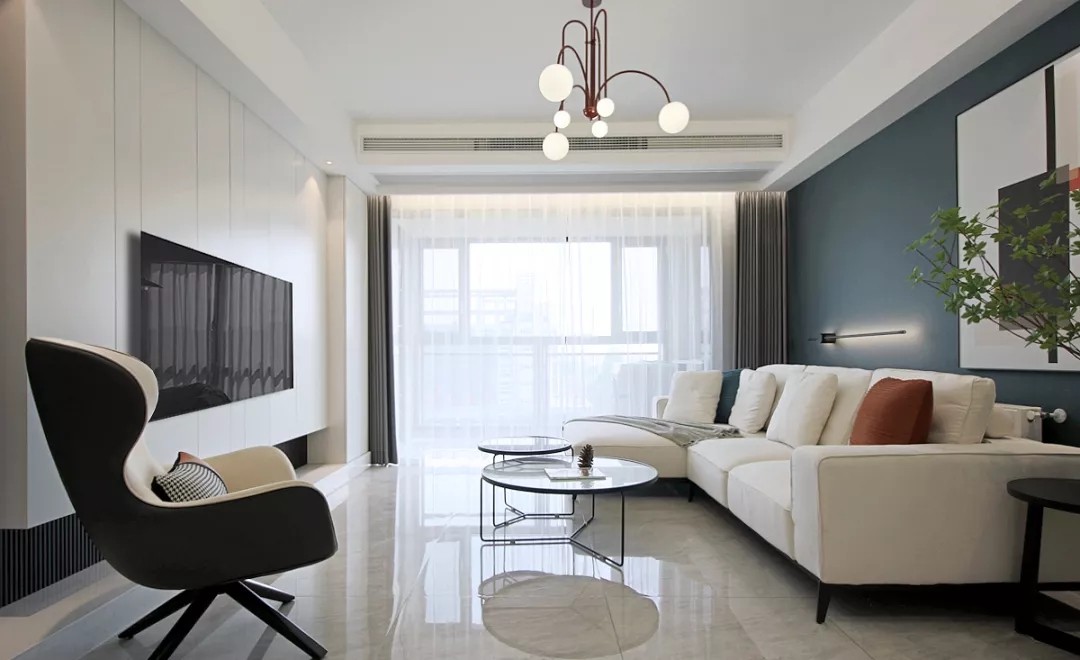 恰当的留白,营造了纯净、温柔又舒适的空间氛围;电视背景墙做了上下留空造型,同色系的设计,超薄的地台,既有设计感也符合屋主喜欢的纯色空间,与阳台之间以曲面过渡,空间气质更为温柔和缓。