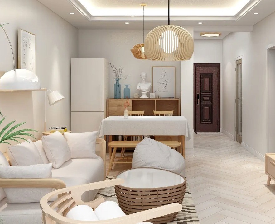 客餐厅色彩搭配选用了白与原木色的清新风格