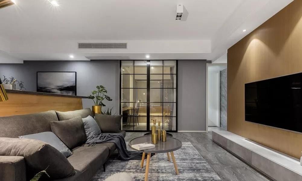 客厅整体以简约舒适的空间,灰色的地面砖、地毯与沙发布置,结合电视墙的木饰面,布置出一种自然轻松的氛围感。
