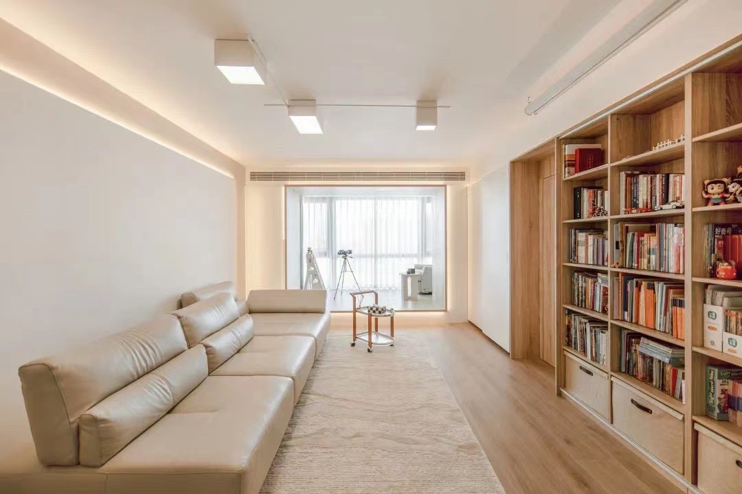 整个客厅的几面墙体布满了收纳柜,白+木的配色明亮温馨,顶天立地的内嵌式设计,不会造成丝毫的压抑感。