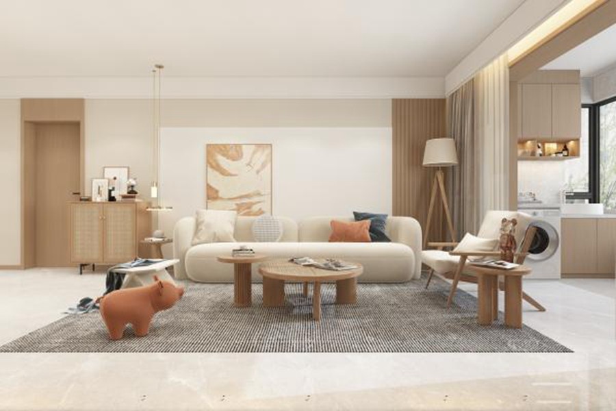 电视背景墙护墙板隐形门造型以简单的奶油系配色温柔了整个空间。