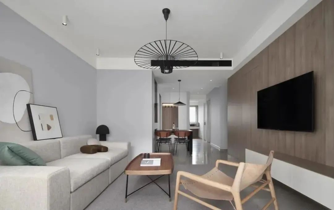 客厅空间整体以灰色系为主,再配上灰色地毯、米白色布艺沙发、木质茶几、木饰面的电视墙、木色茶几与休闲椅,简约中透露出一种大方的舒适氛围。电视墙以木饰面为背景,电视墙上还装上隐形门,壁挂电视机与悬空的电视柜搭配,整体设计显得简约自然,令人轻松舒适。