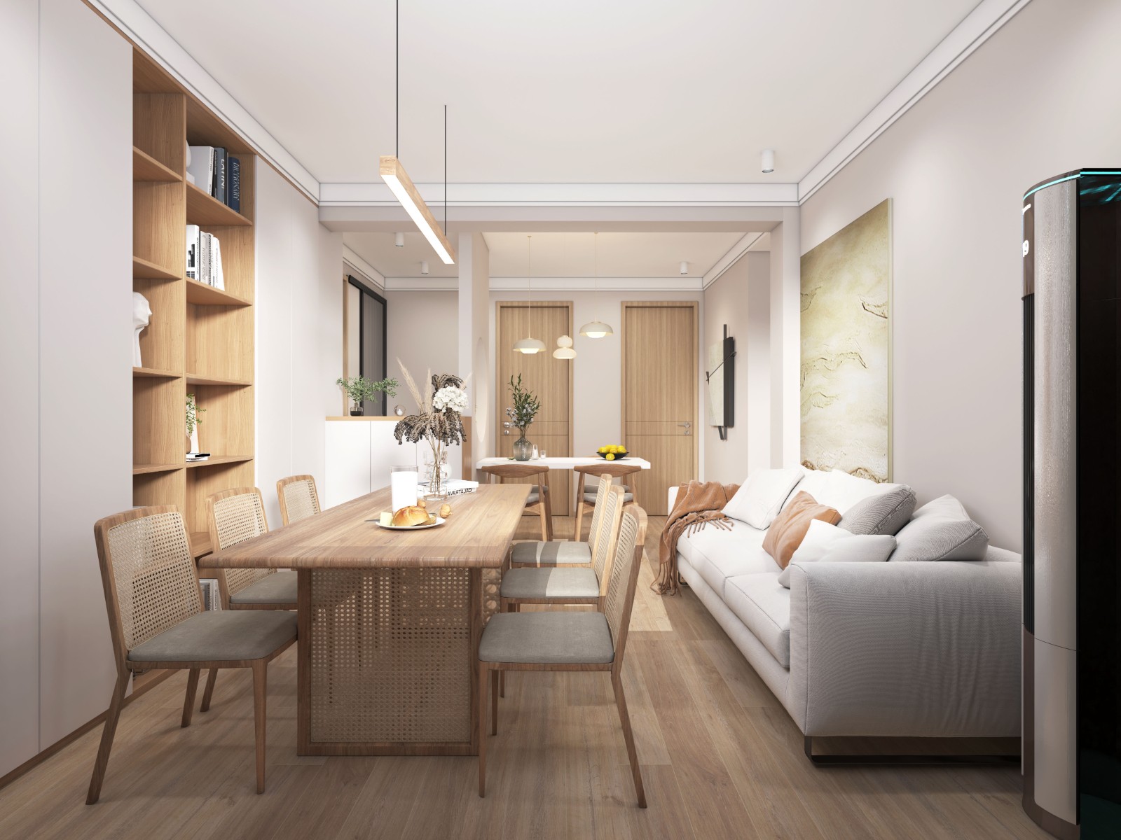 没有采用传统的客厅布局,采用了时下流行的去客厅化设计,中间一条长桌取代了传统的茶几和电视柜的设计,长桌可以满足用餐和办公的需求。