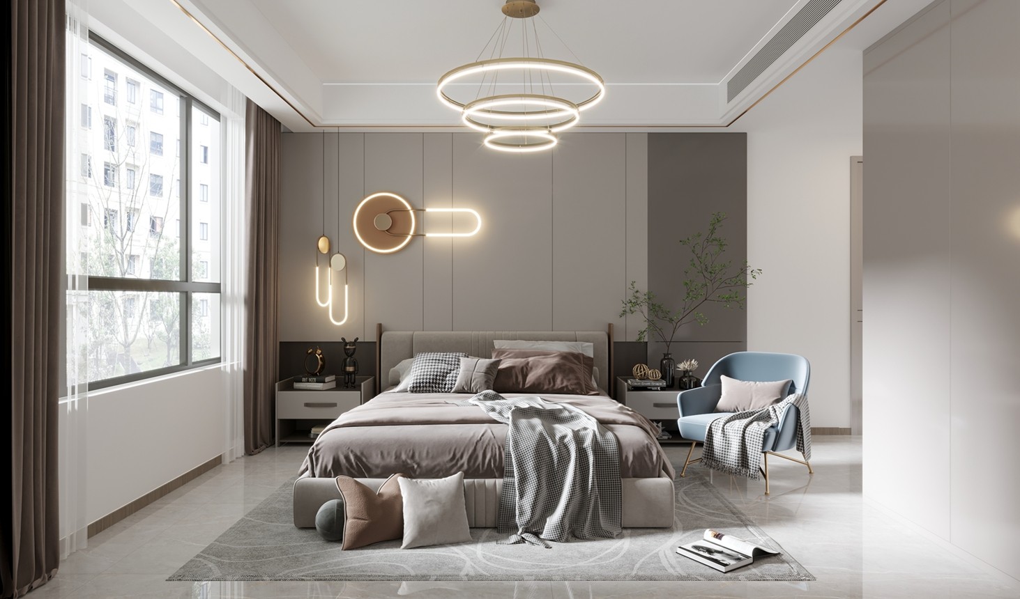主卧空间比较大,背景墙采用硬包的设计,旁边的小吊灯方便居家生活,也增加了质感。