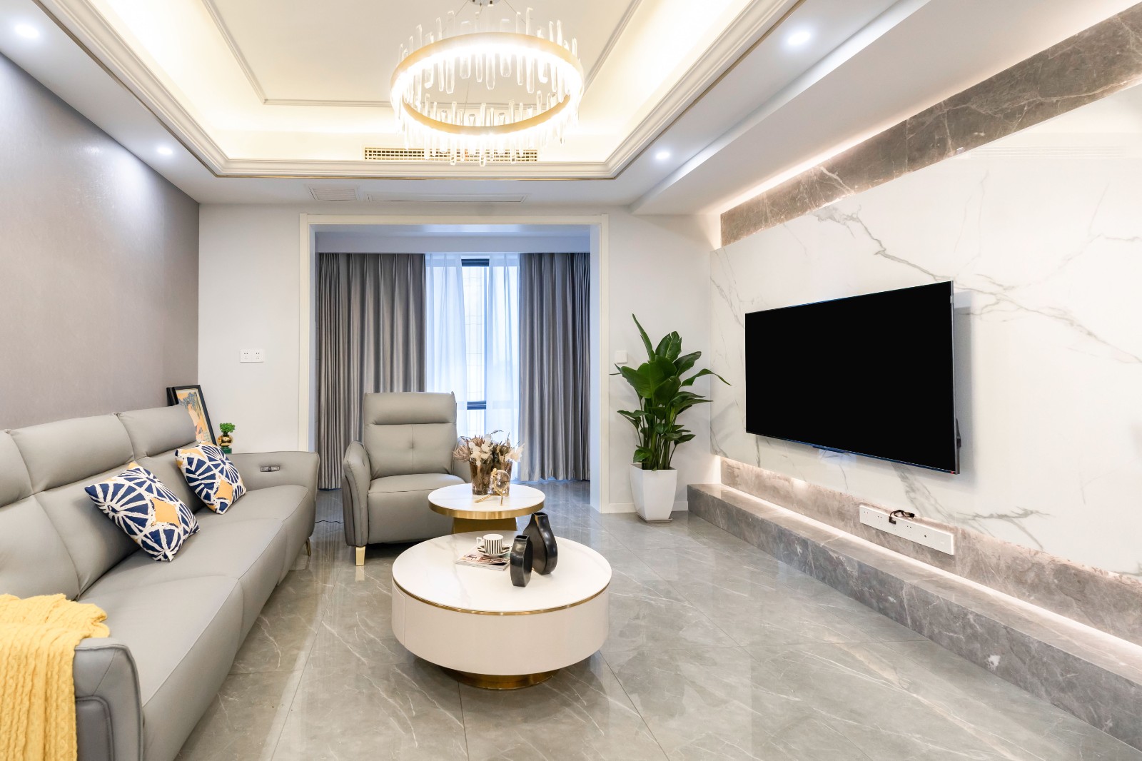 白色大理石小圆桌的叠放让客厅的整体画面充满立体感。