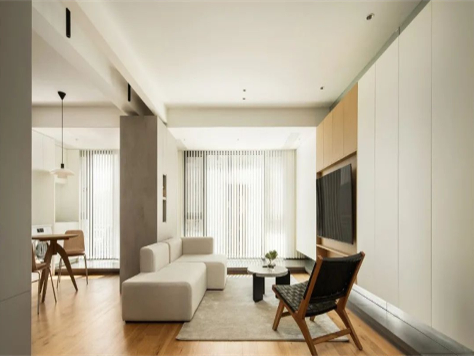 受整体层高影响,让客厅大空间的梁体保持裸露,再置入两个黑色明装射灯,打开房间后留下的承重柱,通过灰色饰面柜对其进行包裹,为这个木白色系的温暖空间找到一个中心平衡点