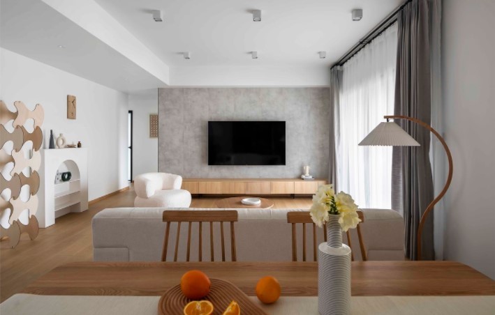 整个客厅墙面刷的浅灰色的乳胶漆,浅灰色能更加凸显原木的质感。