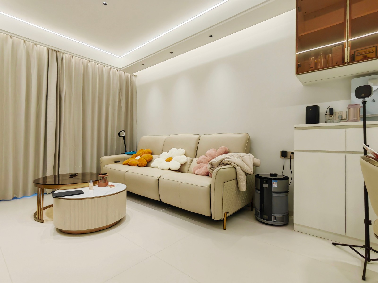 智能家居和无主灯奶油风结合。提升家居幸福感软装,地面通铺奶白色哑光地砖,吊顶天花的设计和灯带,给予视觉上的空间扩大,简约又不失质感。甜而不腻是这个设计难以拒绝的治愈温柔家。
