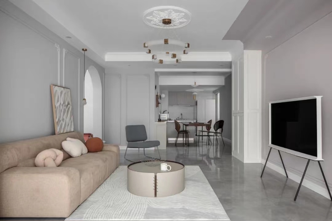 墙地大面积的云母灰,配上沙发的浅咖,自然和谐不失温馨。