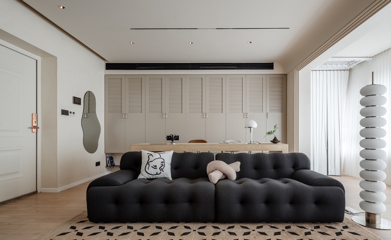 储物柜、办公区、沙发和地毯由高到底依次排开,不同的体量在黑、白及原木色中统一协调起来。不设主灯,阳台内包,视线顺畅的在空间内游走,保证空间的完整性。