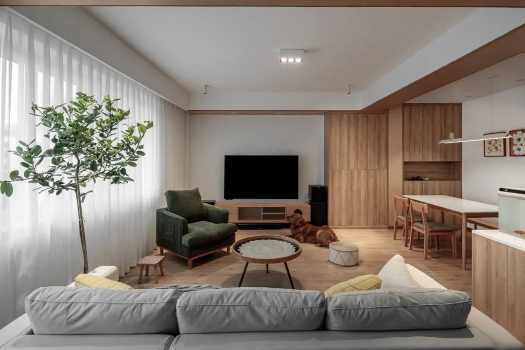 在充分考虑空间秩序和功能需求的情况下,清理干净窗外的防护栏,打通餐厅墙体与客厅连成一体,开放的视野和动线形成视线上的交叠。
