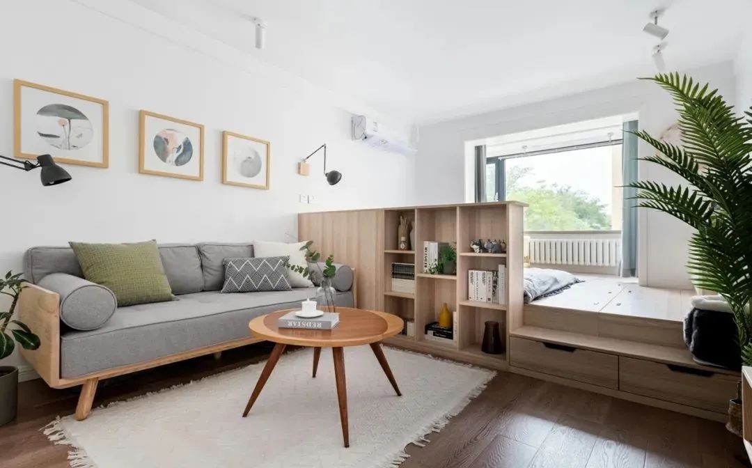 主卧,定制了榻榻米,上面做翻盖式收纳。与客厅间打造了半高隔断,既增加了收纳,也不会影响采光。