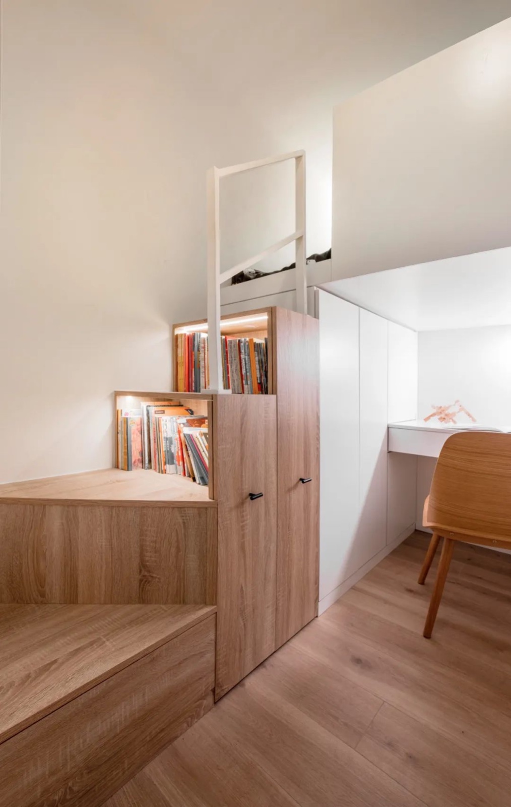 儿童房,将儿童床设置在上层,下面的空间作为孩子的学习区。楼梯也被设计成收纳柜,空间的***利用。