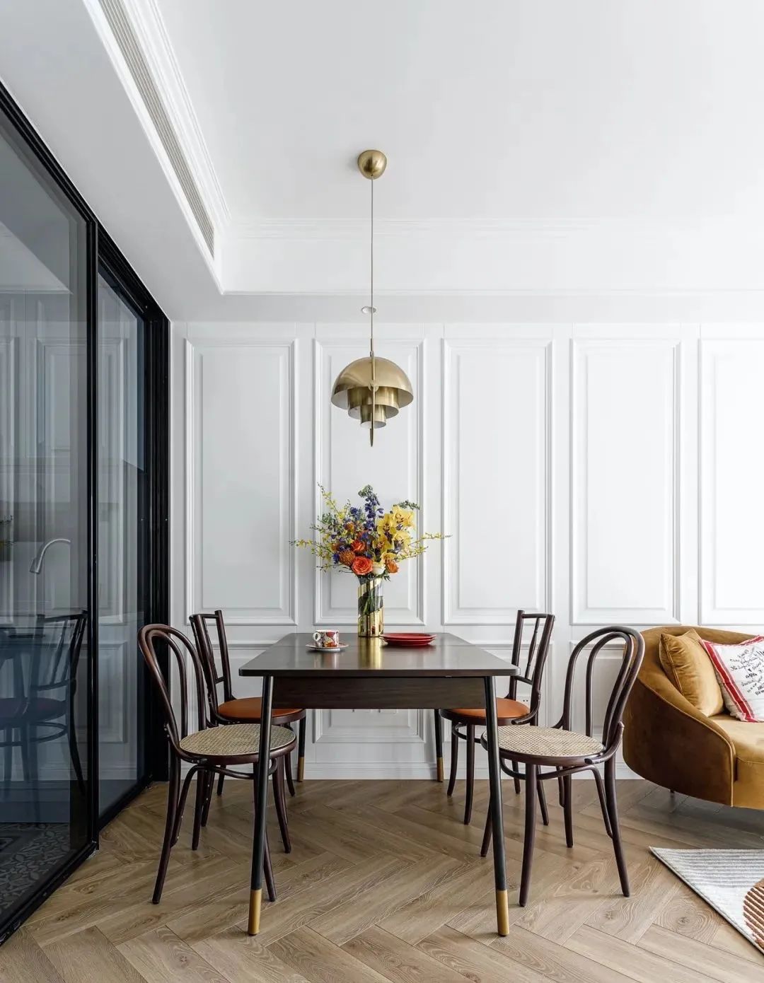 餐厅,紧挨着客厅空间,造型轻盈的餐桌椅,搭配人字拼地板,营造出法式独有的浪漫氛围。