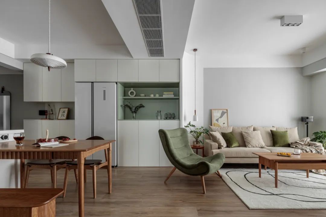沙发旁边的储物柜增大了储物的空间,同时也形成了入户的玄关功能,沙发自然嵌入其中,沙发旁边用了弧形的造型来过度,一盏小的吊灯也是氛围感十足。