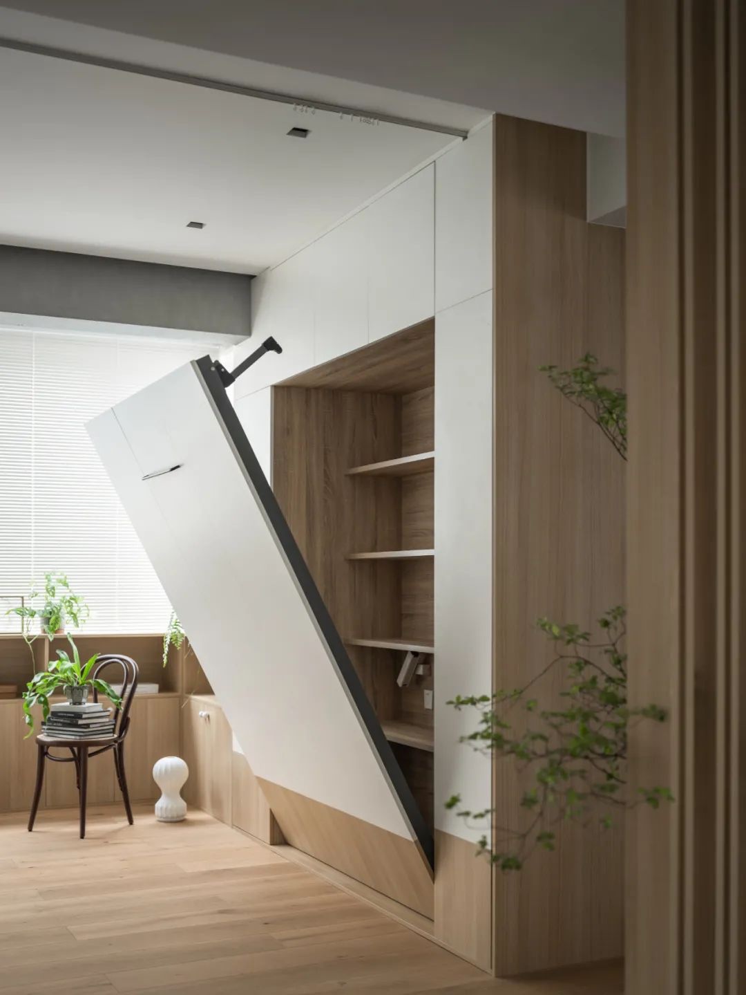 客厅柜内设置翻折床和拉帘,以备长辈或朋友临时的到访和留宿。