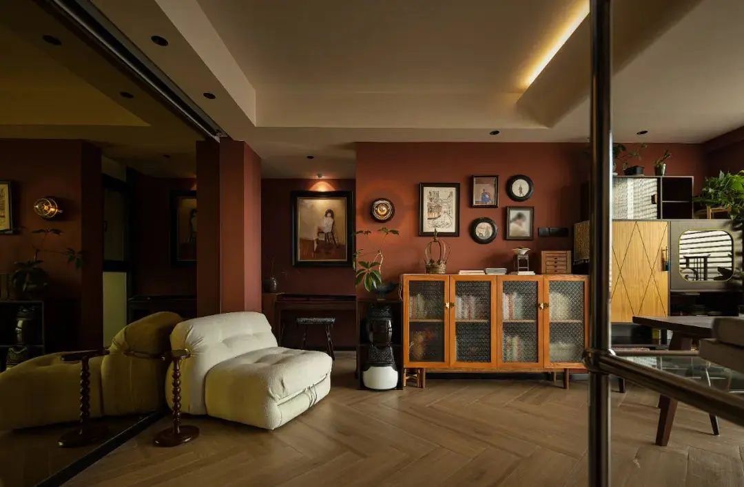 为了扩大空调并协调色彩,休闲区背后特别选用了跟古代铜镜一样的铜色染色镜面做装饰拉升空间。