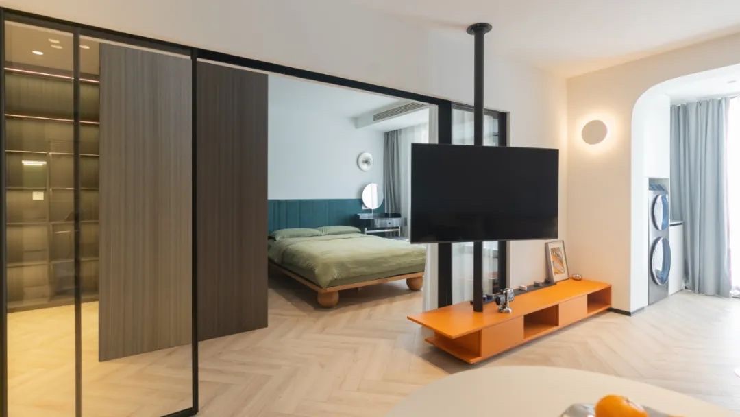 电视可绕轴旋转,方便瘫沙发或坐餐桌或靠在床上看电视。电视柜的悬浮,让整个空间更轻盈。