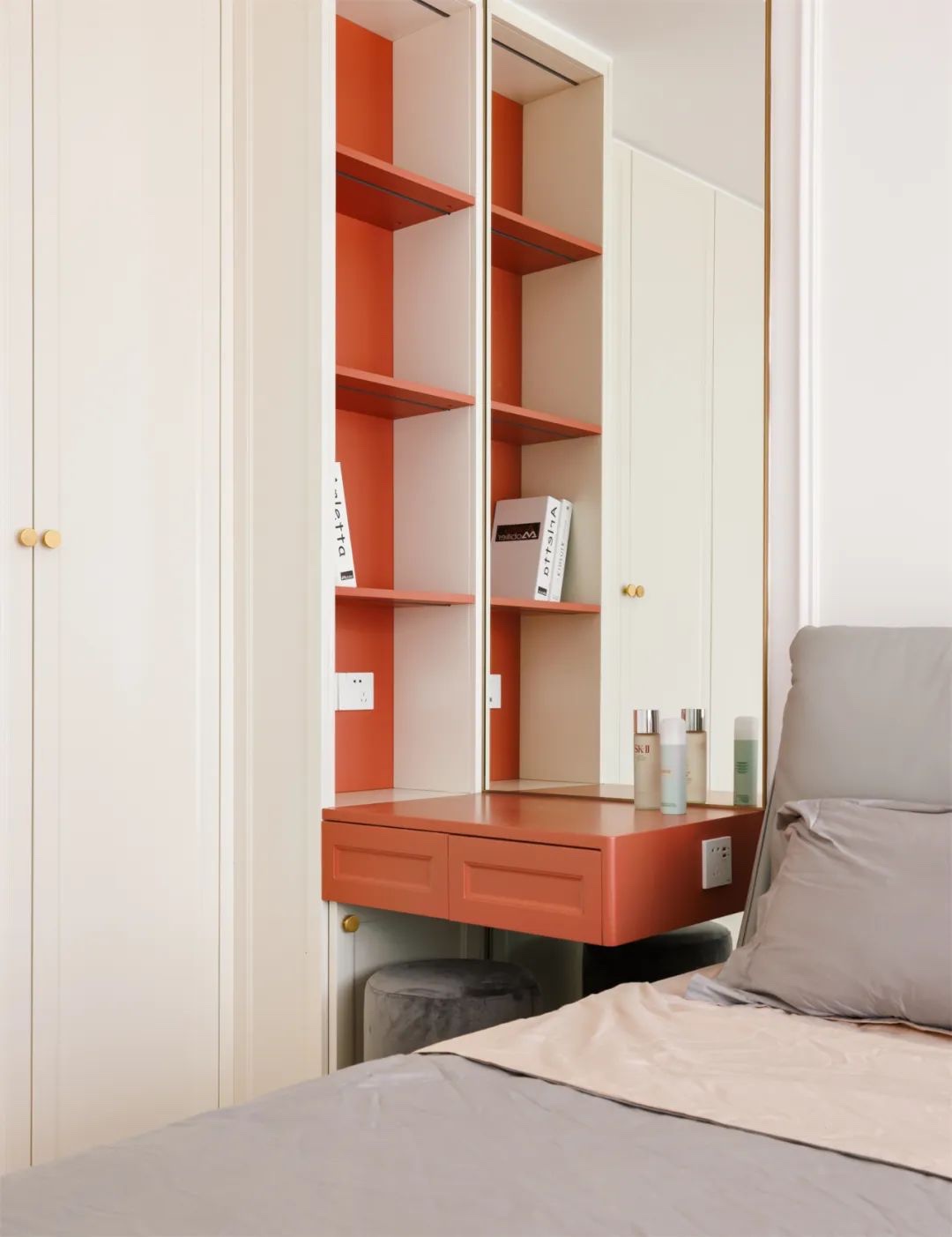 在梳妆台一侧,利用柜体关系,设计了化妆品收纳层板,多少瓶瓶罐罐都放得下。
