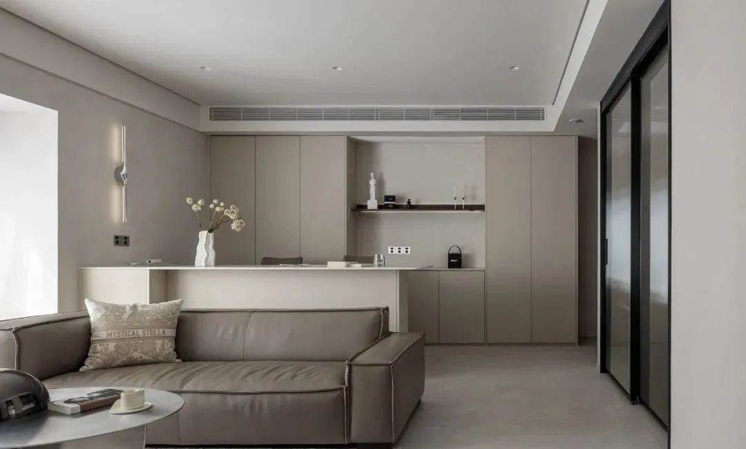 全屋微水泥融合意式奶油艺术漆、奶咖板柜,以及同色系岩板,利用搭配简洁的几何构成来强调整体舒适视觉。