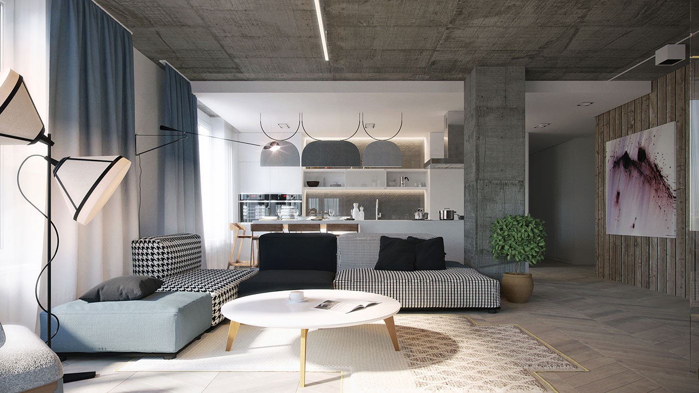 灰色系在客厅展现得淋漓尽致。土灰色的天花板洒脱随性,支撑柱子极具工业风,酷劲十足。整个客厅色系比较统一,简约而不简单。