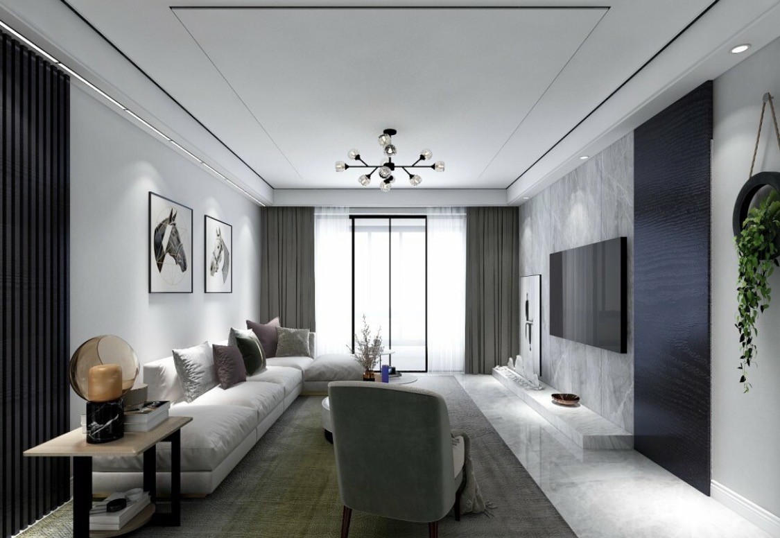 客厅装修最重要的是采光和室内布局。而且还要有巧妙的空间布局。整个空间以白色为主调,电视背景墙以大理石与木饰面拼接,两种材质结合,突出墙面层次感的同时更具质感。