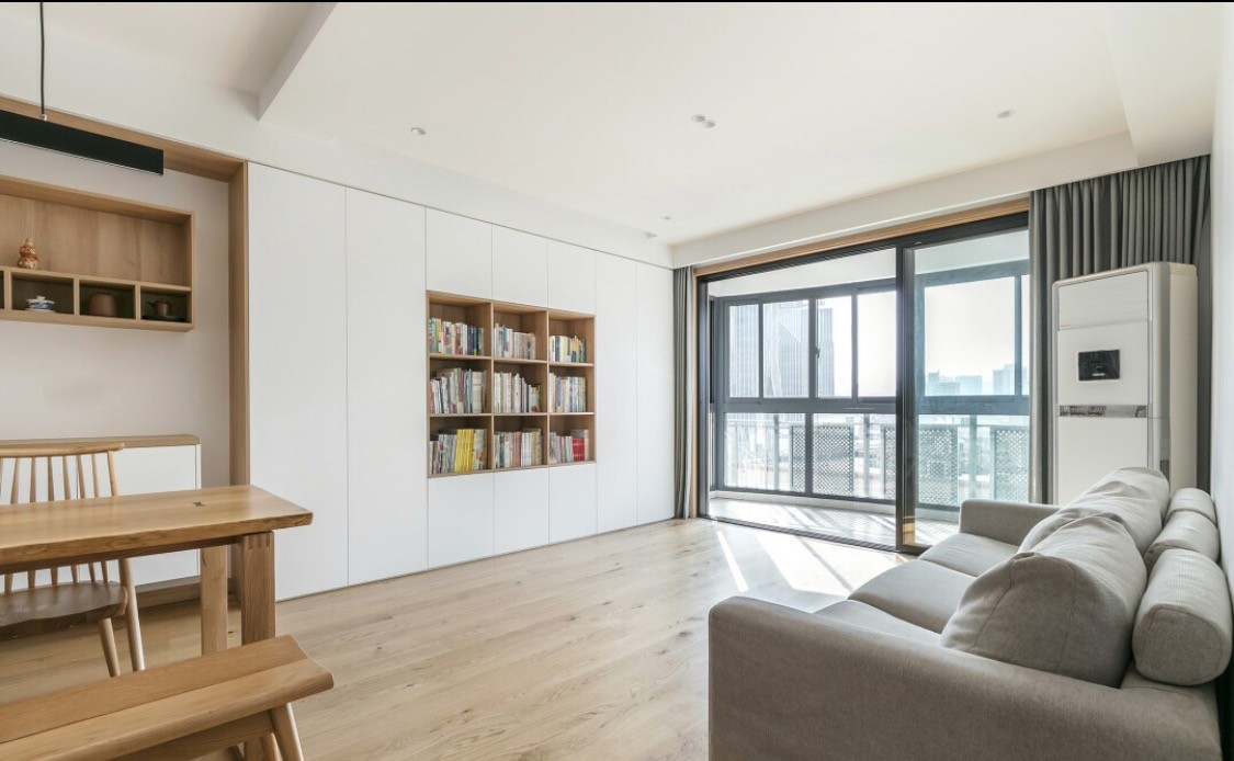 客厅设计书墙代替传统电视墙,也给家里小孩营造了良好的学习氛围。