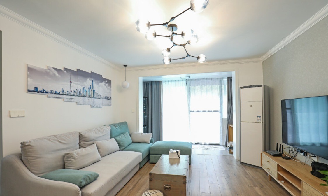 客厅简洁清爽、舒适大气,带有原始纹理的木地板传达出温润的质感。客厅与阳台之间打通,使整个空间更加开阔通透。