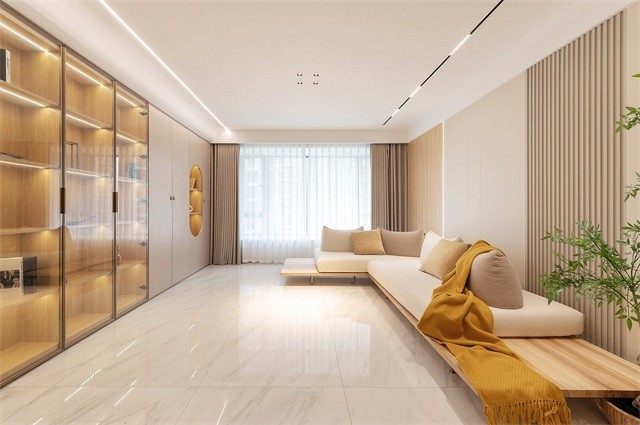 没有茶几、电视、电视墙,设计师杨鑫在家居设计上做减法,保证基础功能的同时也不会显得单调。虽然是传统的竖厅户型,但是在布局上还是贴合一家人的使用需求,L型转角沙发不会影响空间动线,还能提升居住者的舒适度。