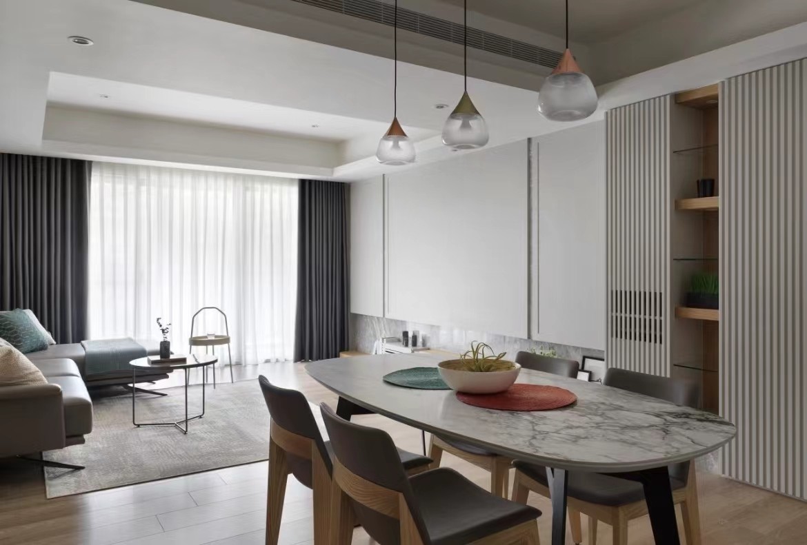 客厅与餐厅为一个整体,虽没有隔断但空间分明。客厅处吊顶比餐厅处更凸出,内部有一小凹槽,设计感十足。