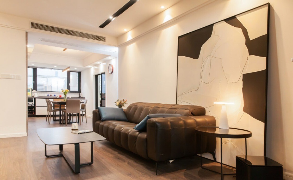 客厅是传统的沙发+茶几+电视的模式,在色彩上延续了黑与白的搭配,整屋实木地板给空间带来温润、雅致的触感和氛围。