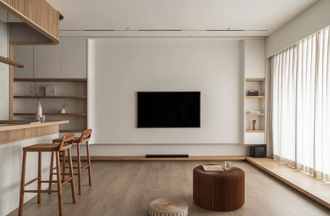 客厅的主题是充满弹性,电视墙以纯白色涂料覆盖,两侧以浅弧收边,延续天花上的线条,同时翻折到电视柜的立面上。