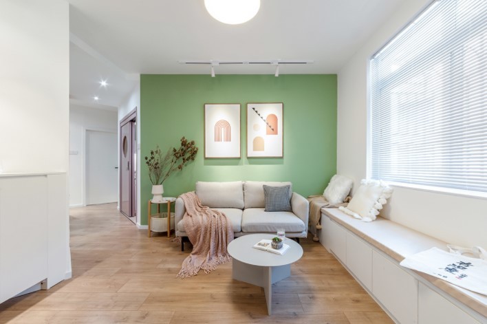 客厅的背景墙设计了清爽的抹茶绿色,闹中取静,一家人在清爽的氛围中说说笑笑更加惬意。