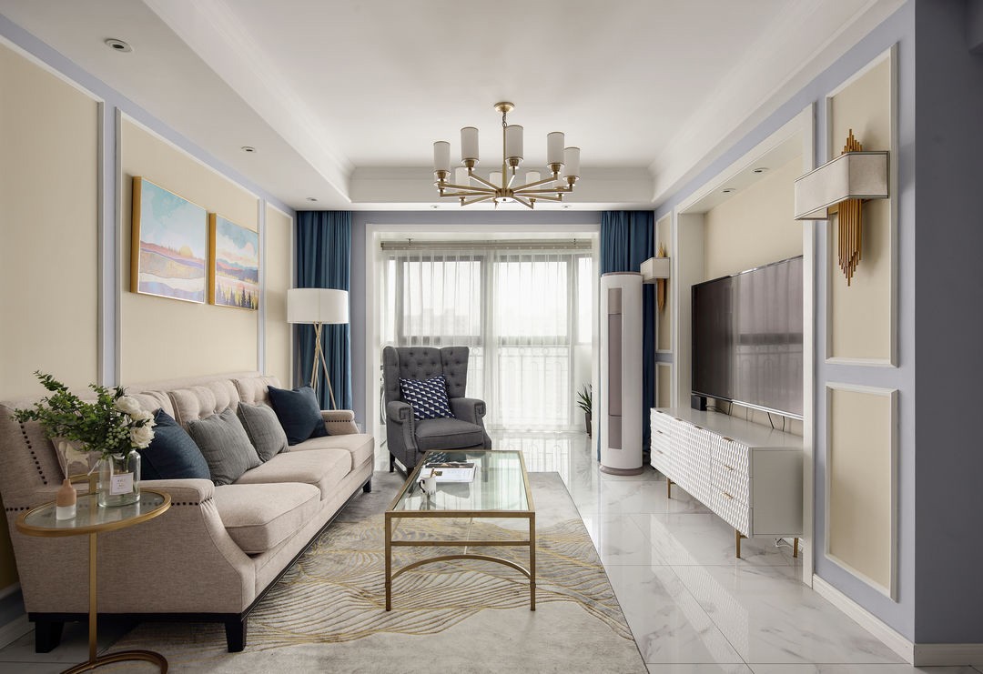 整个空间以米色为主,让这个家增添多一份温馨,米色与蓝色的对比,空间层次看起来更加丰富多彩,浅灰色的地毯,布置金属+玻璃台面的方型茶几,还有灰色的布艺沙发,整个客厅充满简约的气息与质感。